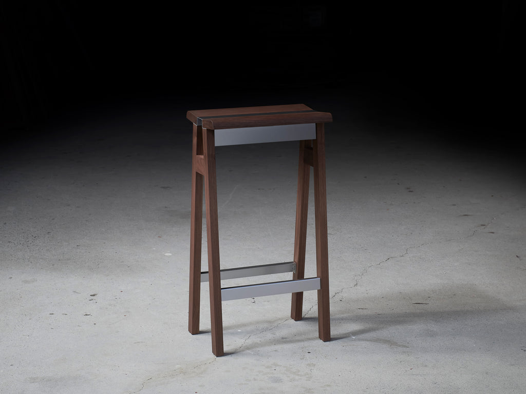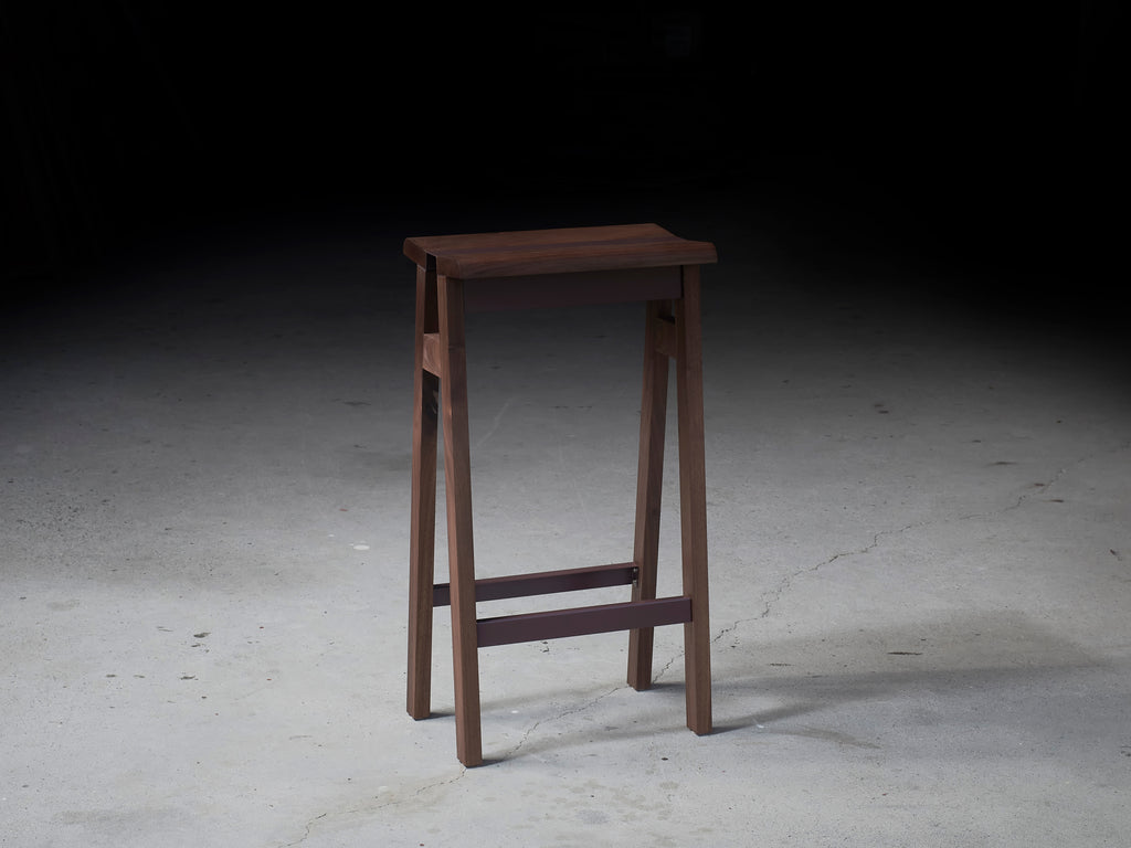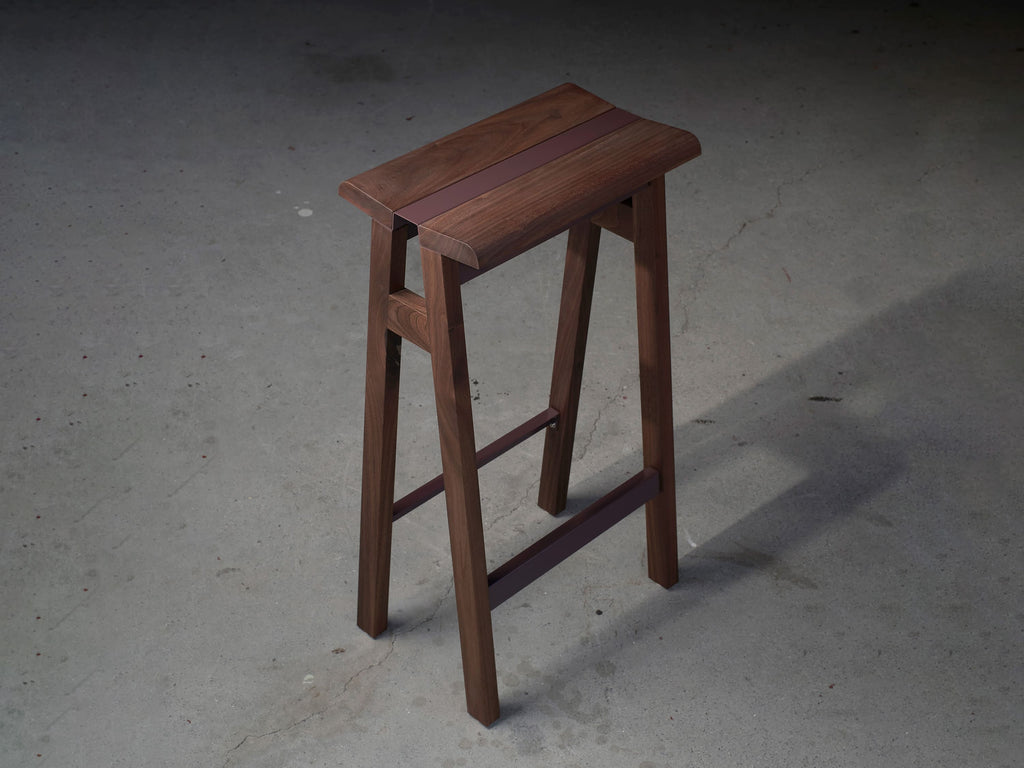 鋼板の持つ無機物的、硬質な印象と、木部の有機的なラインが美しく調和した「hi-stool」座面から覗く折り曲げた鋼板は、構造上重要なパーツとしてHi.seriesを構成しています。工業的な素材感を持ちながら、木座面との調和によりシーンを選ばず空間のアクセントに最適です。樹種はオークとウォールナットの2種。明るい色味が美しく様々なシーンと相性の良いオーク、装飾的な木目を持ち重厚感のある素材ながら、モダンな空間を演出するウォールナット。