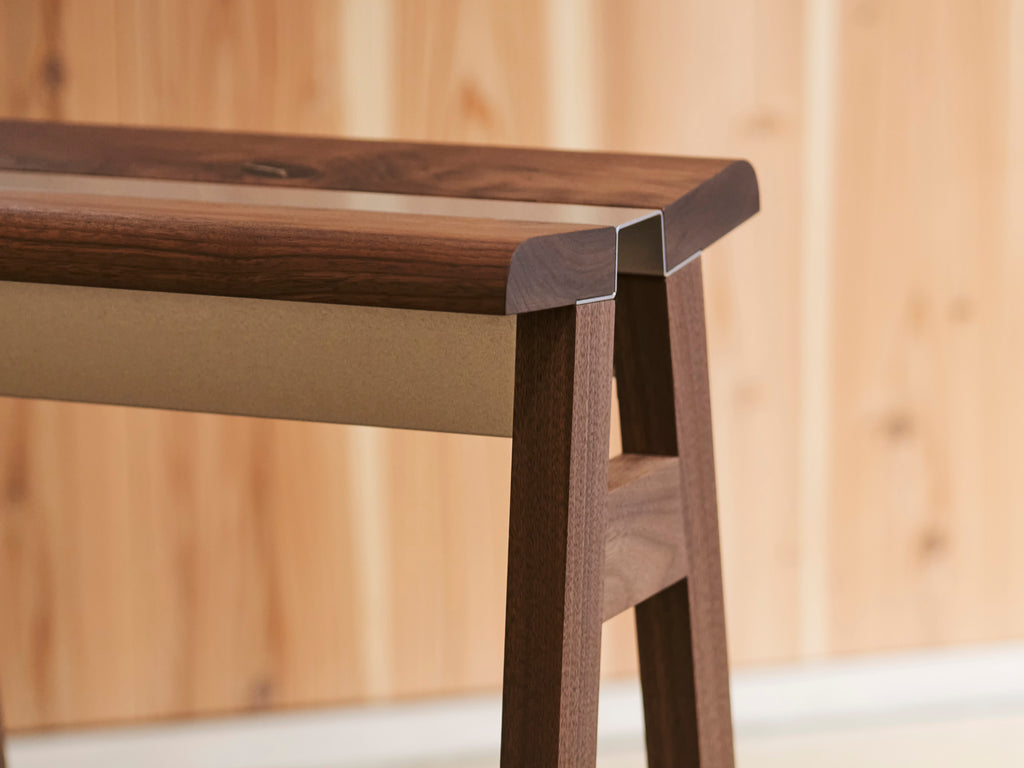 Hi.seriesstool / hi-stool / benchの3アイテムからなるHi.seriesは、折り加工を施した鋼板を座面の一部とし、構造・造形の中心として構成したFulcrumのファーストコレクションです。鋼板パーツは、大きく面の落ちた木座面との調和により、優婉な表情を空間に覗かせます。